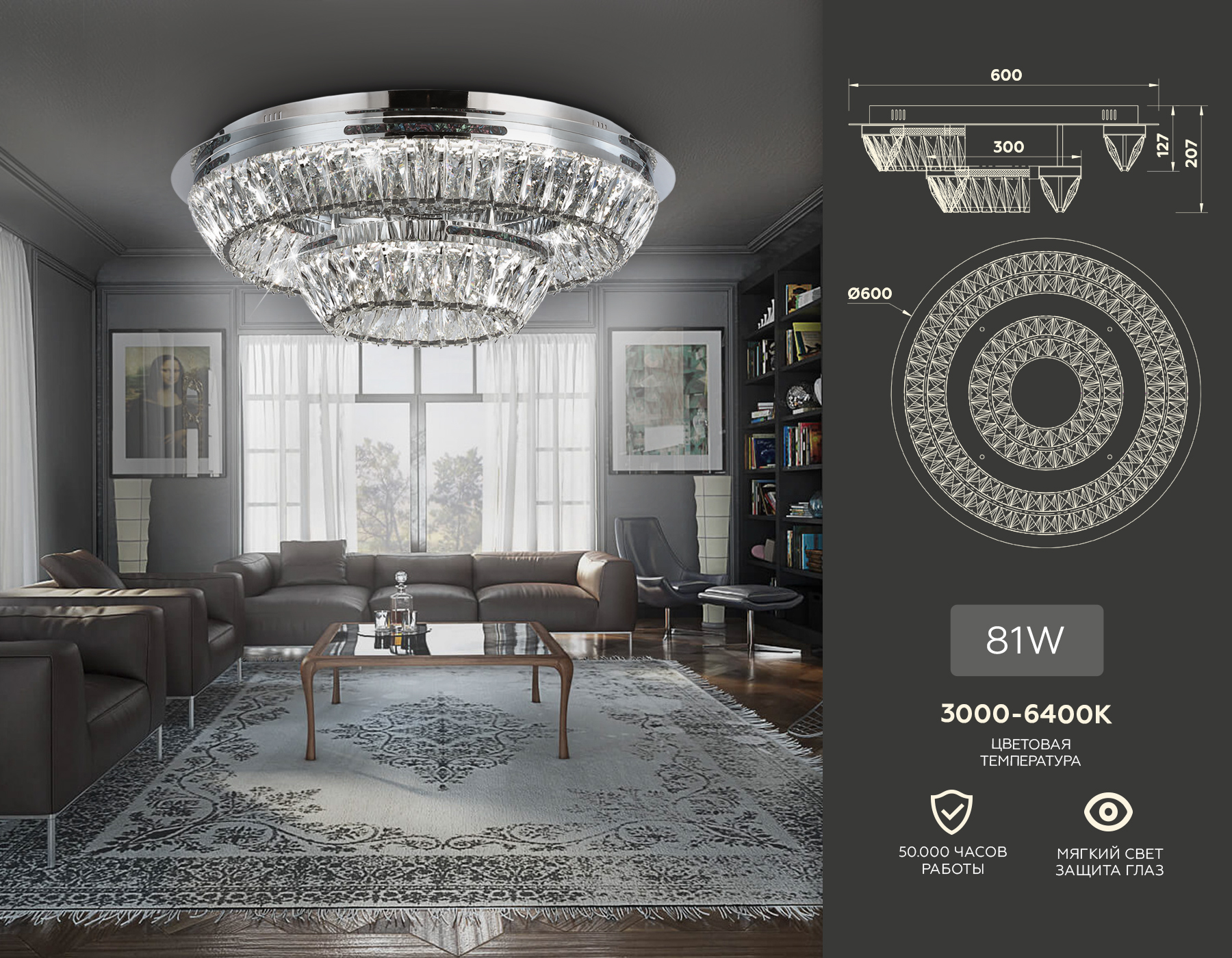 TR5029 CH/CL хром/прозрачный 3000K/4200K/6400K 81W D600*207 (Без ПДУ)