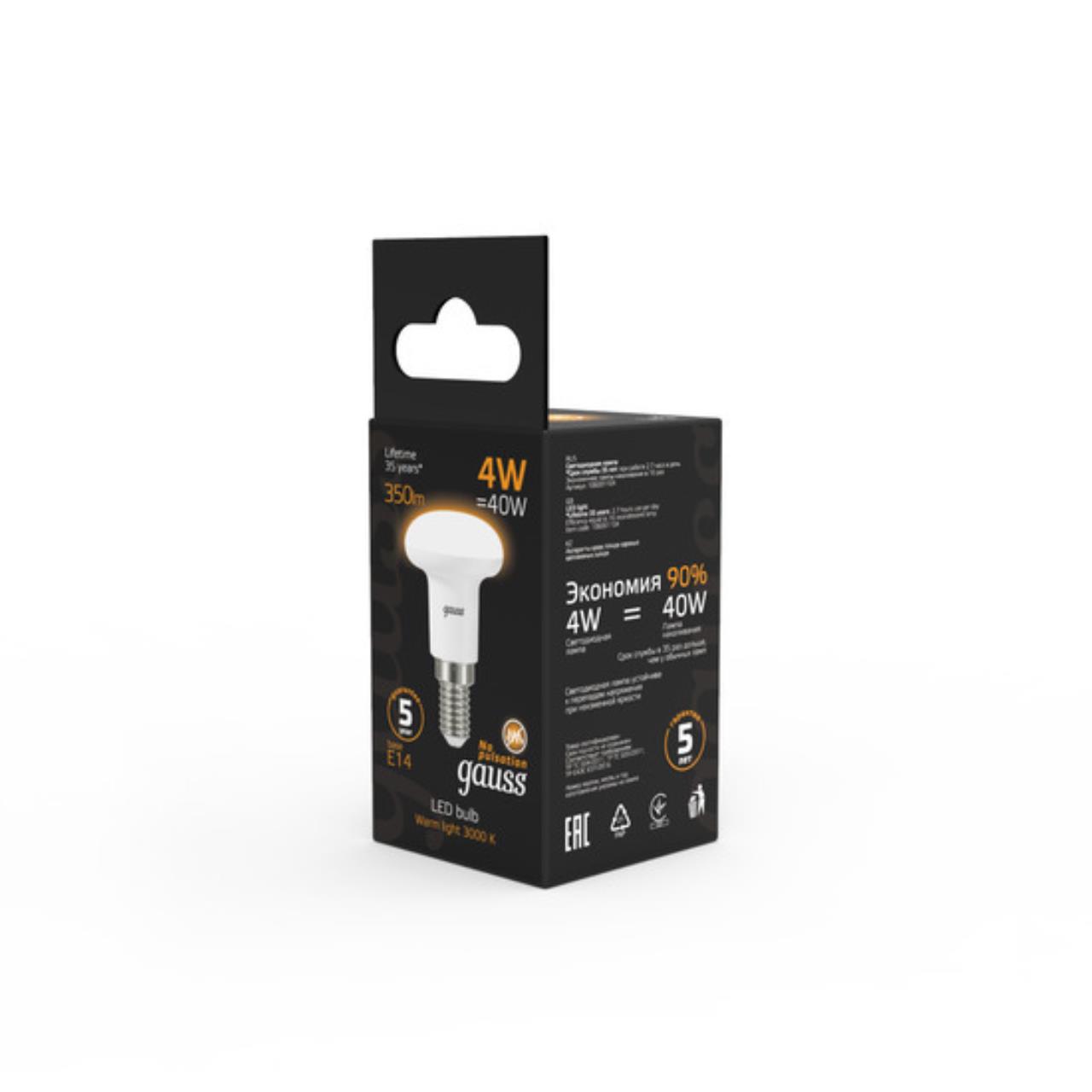 307,00 ₽ 1 в наличии 60 4 6 Алюминий||Пластик Светодиодная лампа Gauss Рефлекторная 4W 350Lm 3000K E14 106001104 E14 2 Нет 20 РОССИЯ Короткий Маленький 120 Теплый 106001104 Лампа Gauss LED R39 E14 4W 350lm 2700K 1/10/50