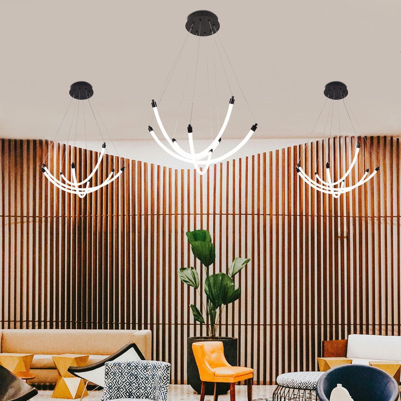 9900,00 ₽ 19 в наличии гостиная; спальня; кухня; детская; холл; кафе; ресторан; кабинет; столовая; студия в зависимости от размера помещения и требуемого уровня освещения. источником света служат встроенные ленты LED с круговым расположением светодиодов внутри Металлический каркас черного цвета с четырьмя закругленными гибкими акриловыми трубками белого цвета 3000 4468-3P, подвесная люстра, D520xH1000/1800, LEDx22W, 1880LM, 3000-6500K, included, remote control