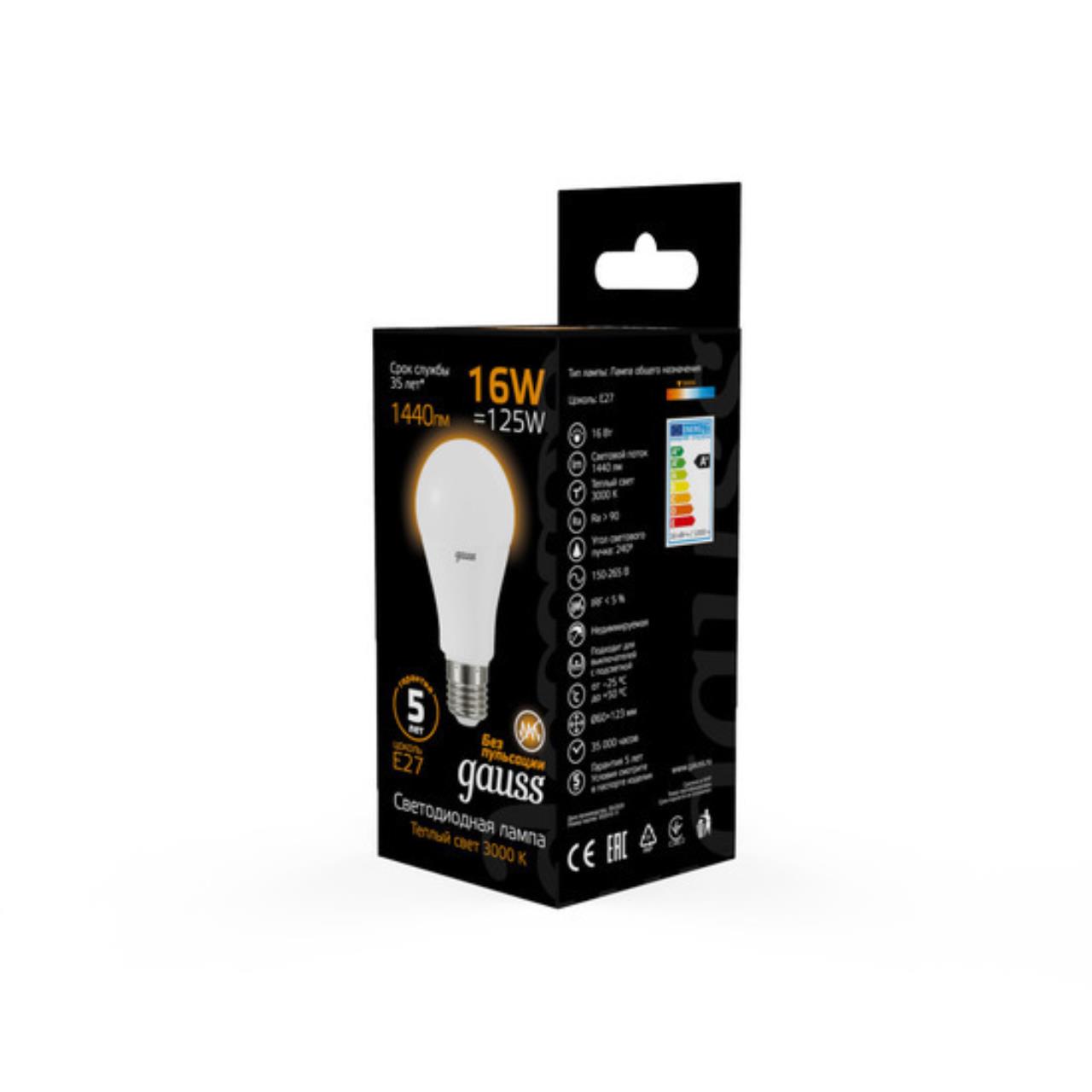 Светодиодная лампа Gauss A60 16W 1380Lm 3000K E27 102502116