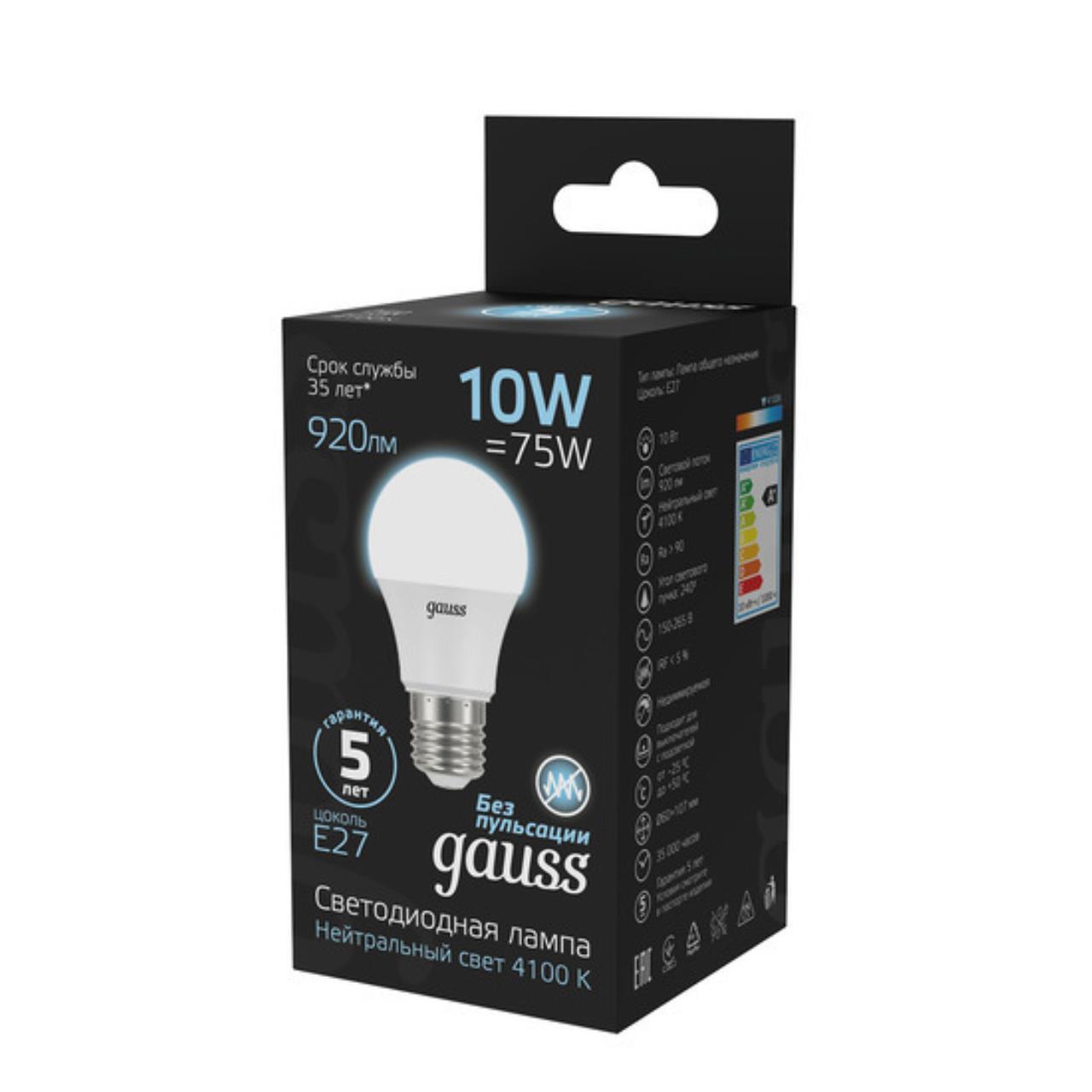 307,00 ₽ 235 в наличии 60 6 11 Алюминий||Пластик Светодиодная лампа Gauss A60 10W 920Lm 4100K E27 102502210 E27 Нет 20 РОССИЯ Короткий Маленький 240 Матовый Нейтральный 102502210 Лампа Gauss LED A60 10W E27 920lm 4100K 1/10/50