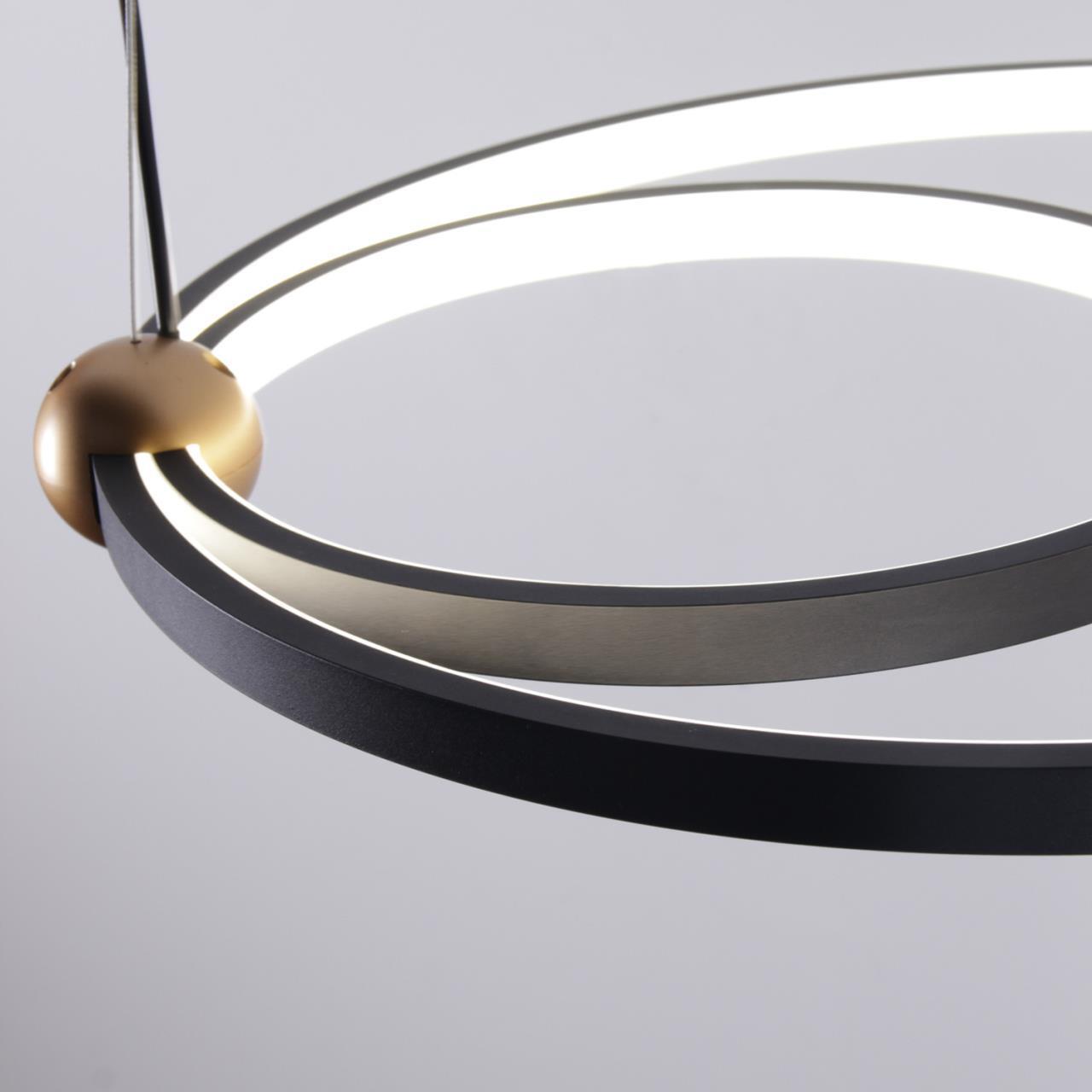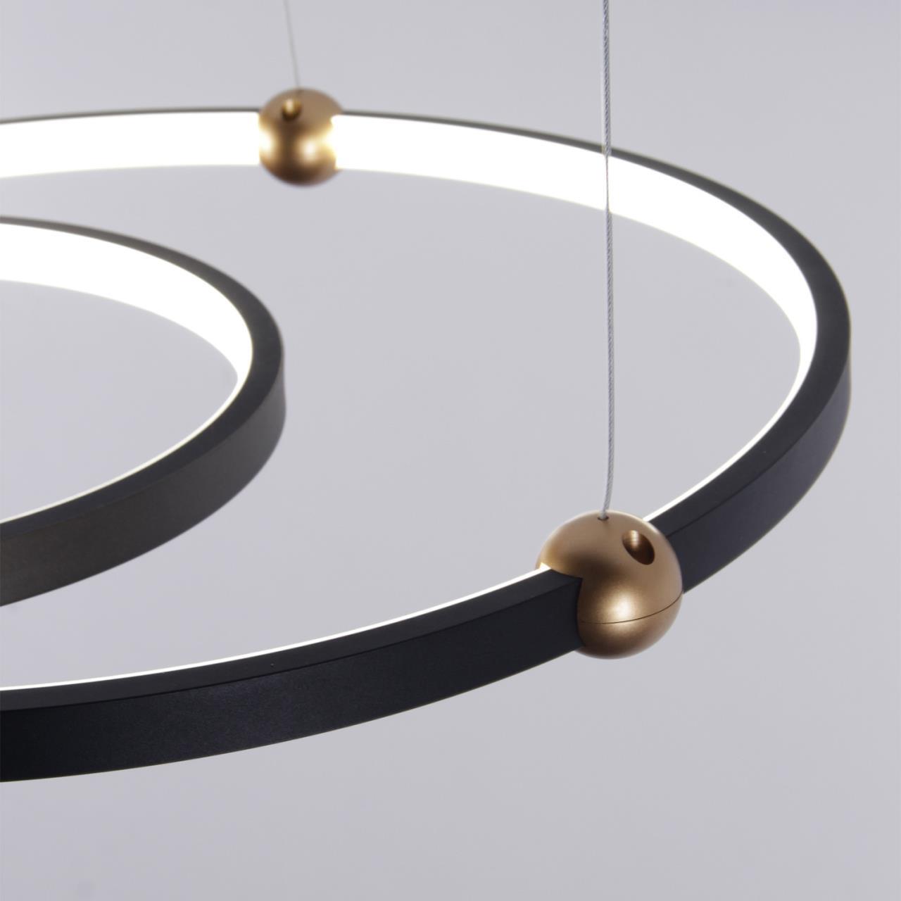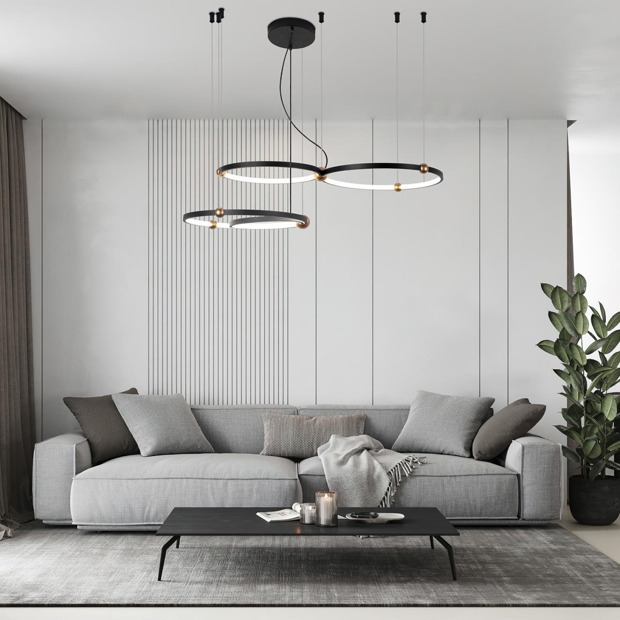 24100,00 ₽ 14 в наличии гостиная; спальня; кухня; детская; холл; кафе; ресторан; кабинет; столовая; студия которые составлены из колец различного размера. Каркас светильников выполнен в черном цвете что придает им легкость и создает визуальное впечатление «парящего» в пространстве. 4569-1P, подвесная люстра, D500xH1600, LEDx40W, 2600LM, 4000K, included